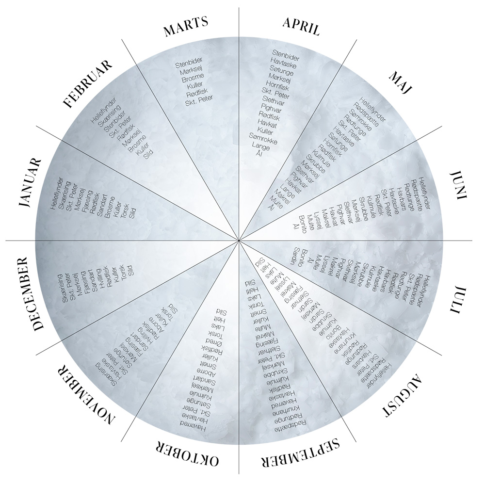 Vi tilbyder et komplet årshjul, der giver dig overblik over danske fiskearter fordelt på årets måneder.